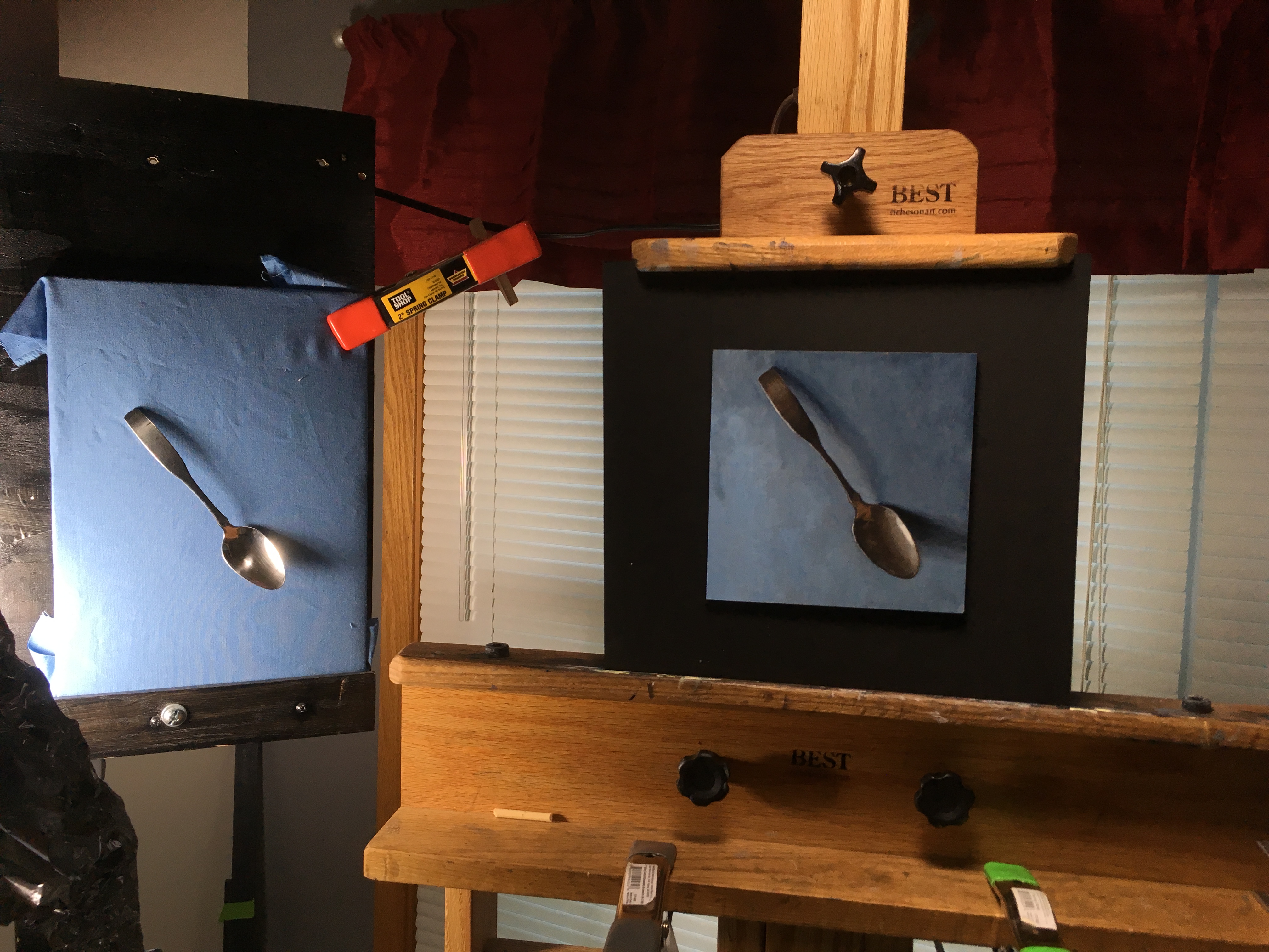 Any advice on how to deal with a highlight that is so bright it makes looking at the still life difficult. (Other than changing the lighting scheme.) I want to capture the brightness of the spoon but it is hard to evaluate value changes when looking at the set up.