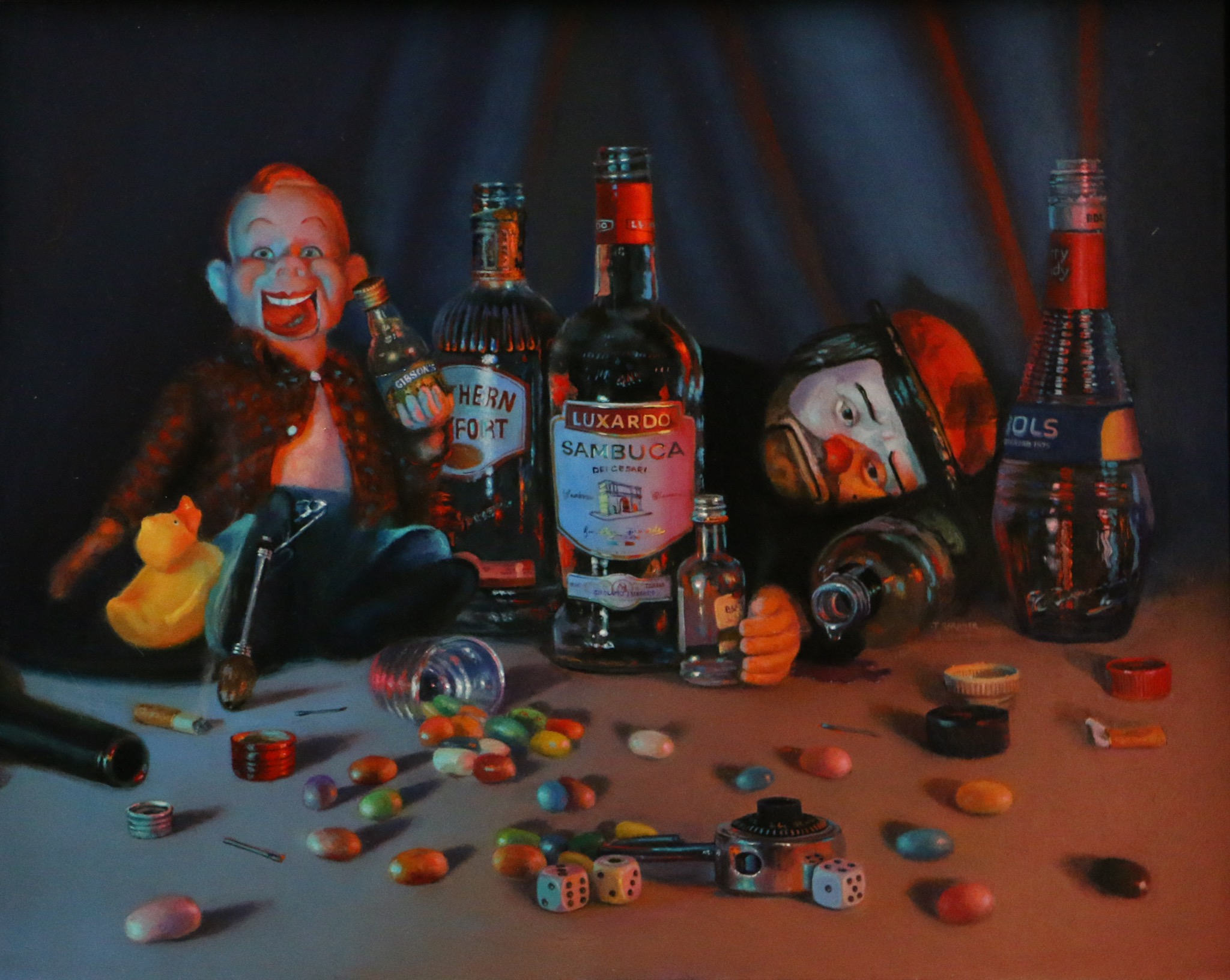 This is an allegory painting. The lock symbolizes youth, and dice the symbolize the gambles we take in life. The Jellybeans represent the fun and colourful things we encounter in our younger years, while the bottles are the ingredients to make the classic jellybean shooter. The vices that we use can have profound effects on us and are depicted by the two puppets- sad clown is down and reaching for the empty bottle, while Howdy is holding a new found full bottle, and is happy; ready to keep going. The little duck is a bit of Canadian humour, it symbolizes the baby duck wine that is cheap and most Canadians are familiar with and have had!! They are in a stage setting;