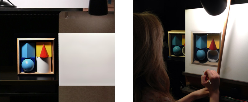 So what happened? The box had been carefully aligned with the drawing or painting surface, the student kept the subject close so as to maximize visual information, and each measurable line, angle, value and/or color was accurately recorded—so why would the overall representation exhibit these problems when the piece is viewed at an increased distance? And why do the objects look like they are falling out of the drawn box?