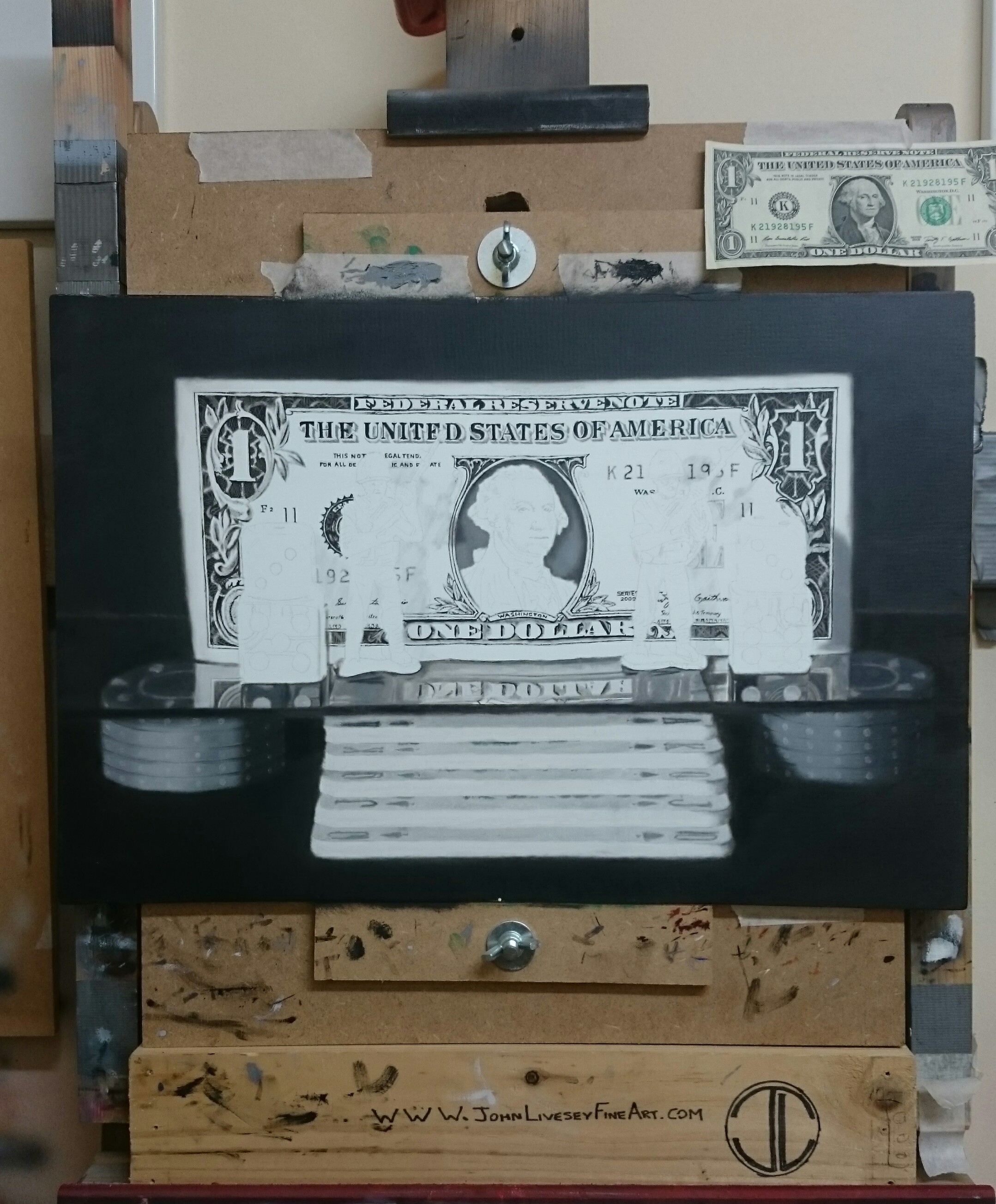 Doing a slightly rougher underpainting as want to have decent guides in places for tackling the dollar to a decent finish. the b/w of the note will alter to have a range of tones in the finished piece.